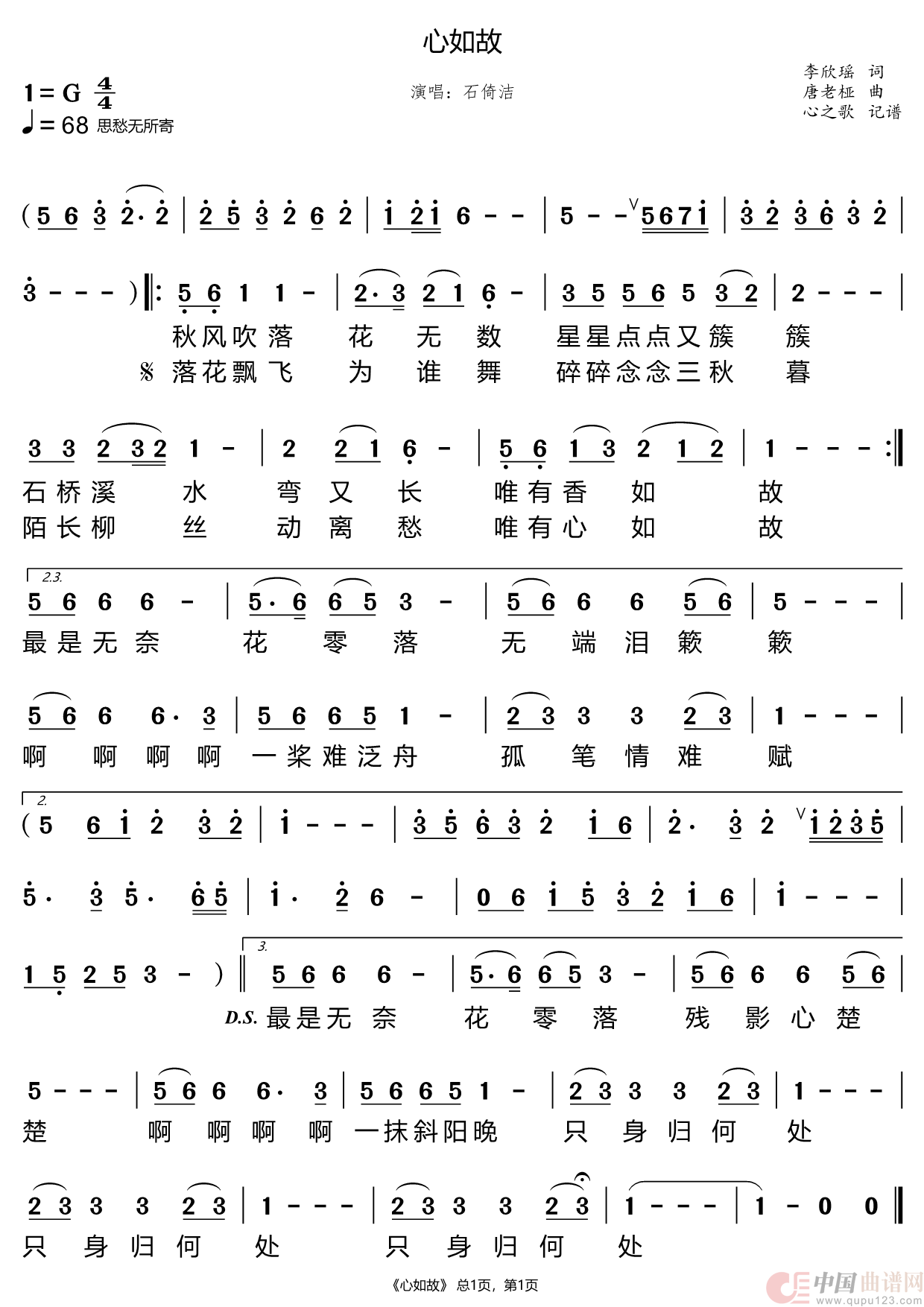 《心如故》最新曲谱 石倚洁-心之歌制谱