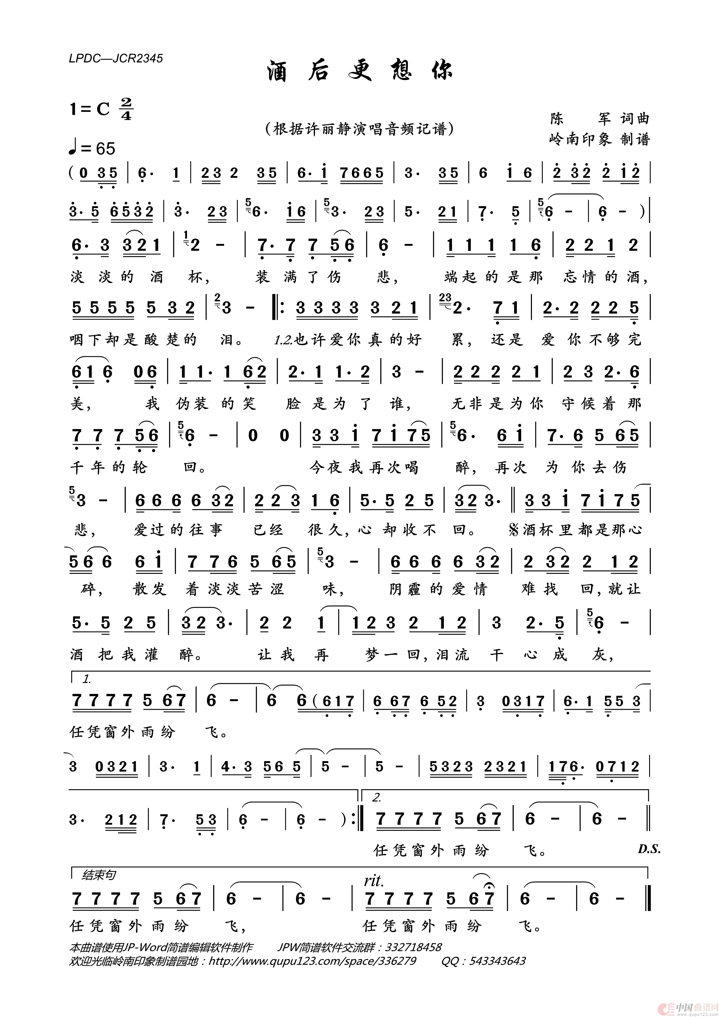 《酒后更想你》最新曲谱 许丽静-岭南印象制谱