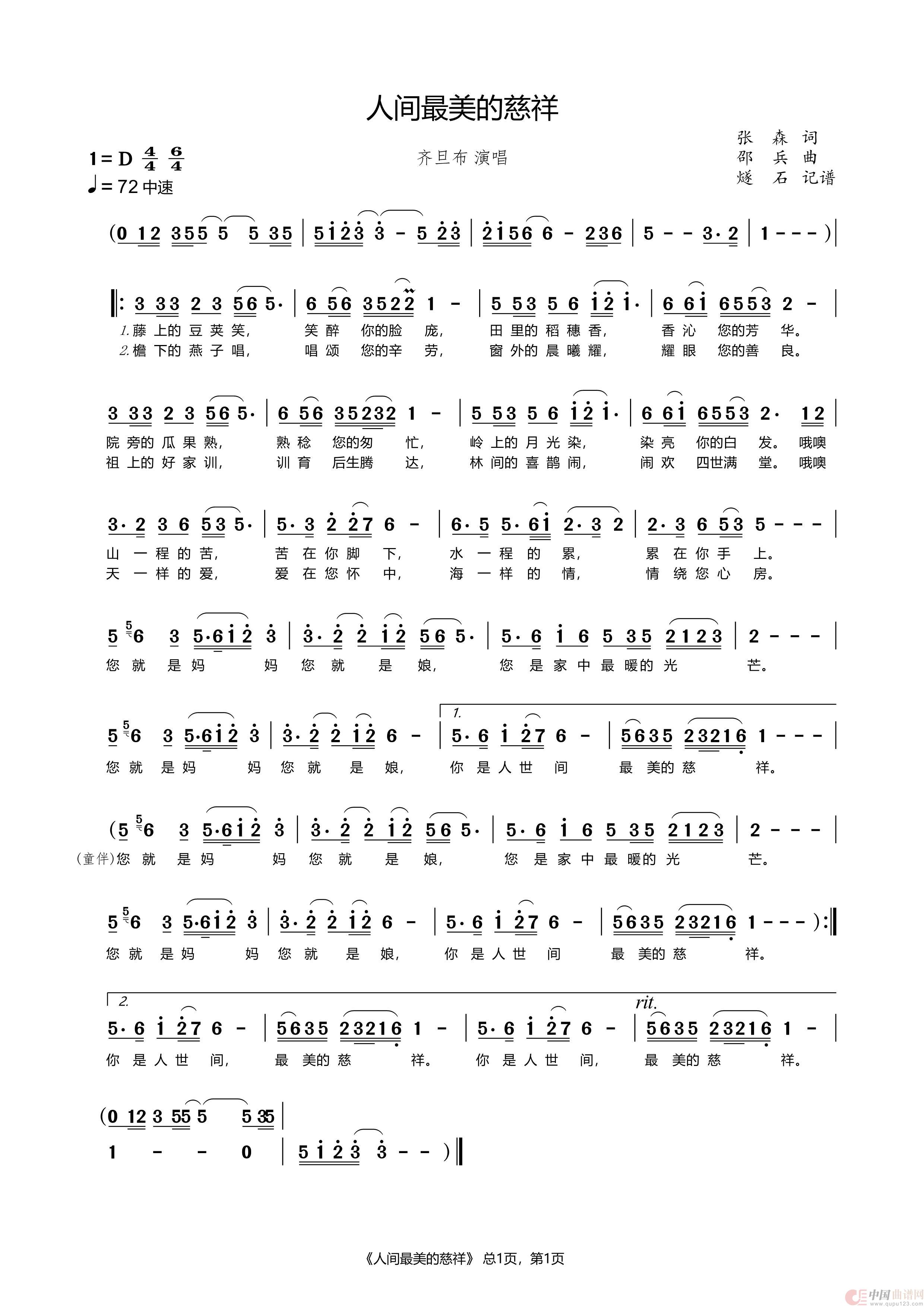 齐旦布演唱的人间最美的慈祥歌词,人间最美的慈祥最新曲谱.