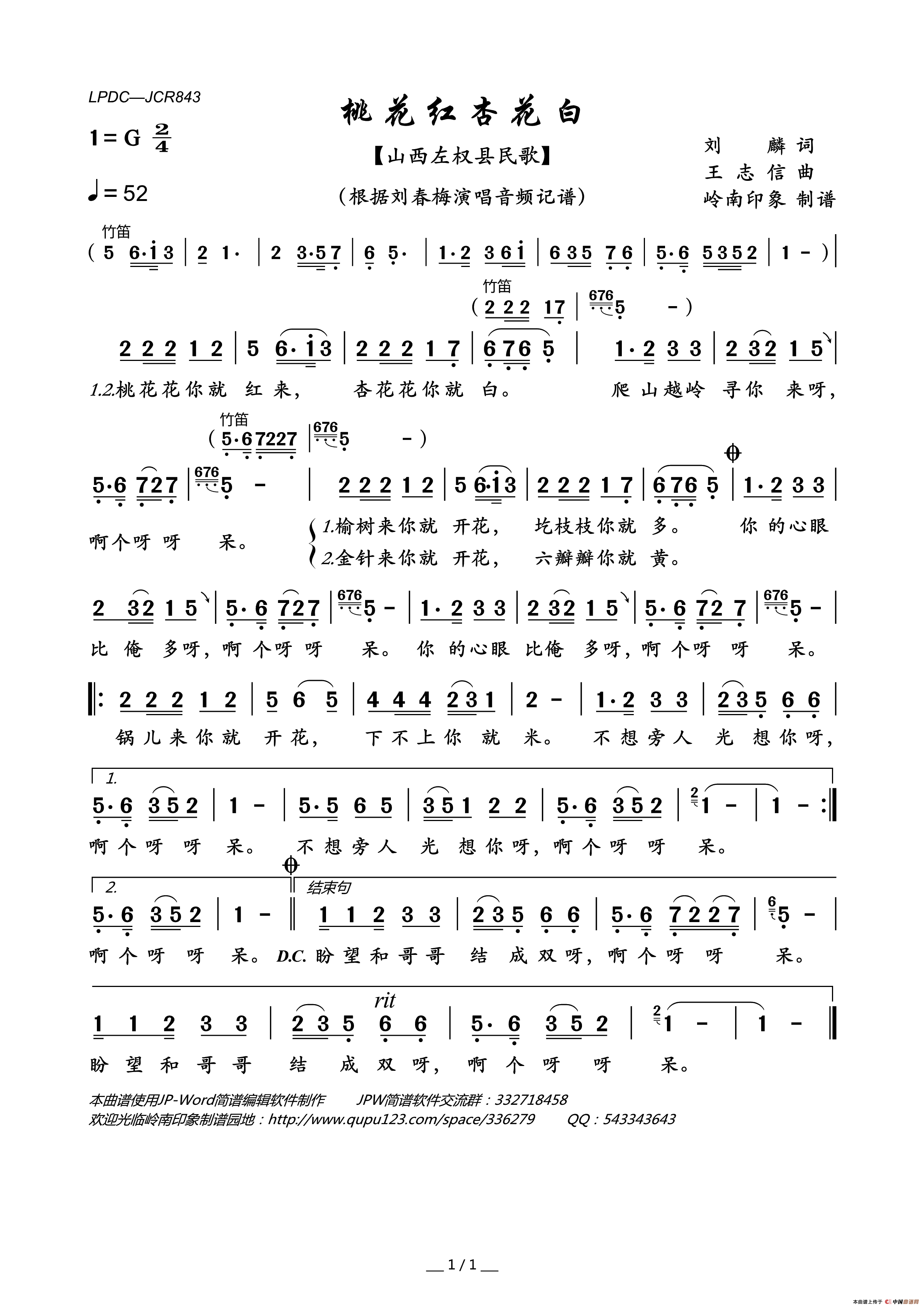 《桃花红杏花白》最新曲谱 刘春梅-岭南印象制谱