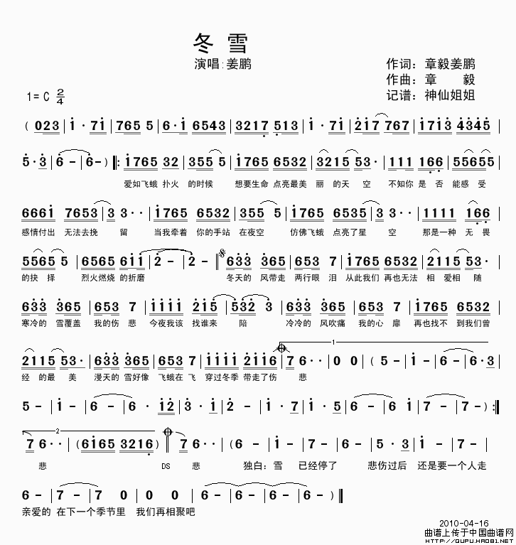 姜鹏演唱的冬雪歌词,冬雪最新曲谱.