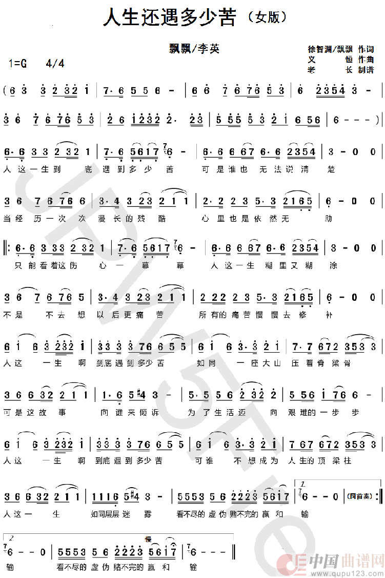 《人生还遇多少苦》最新曲谱 飘飘/李英
