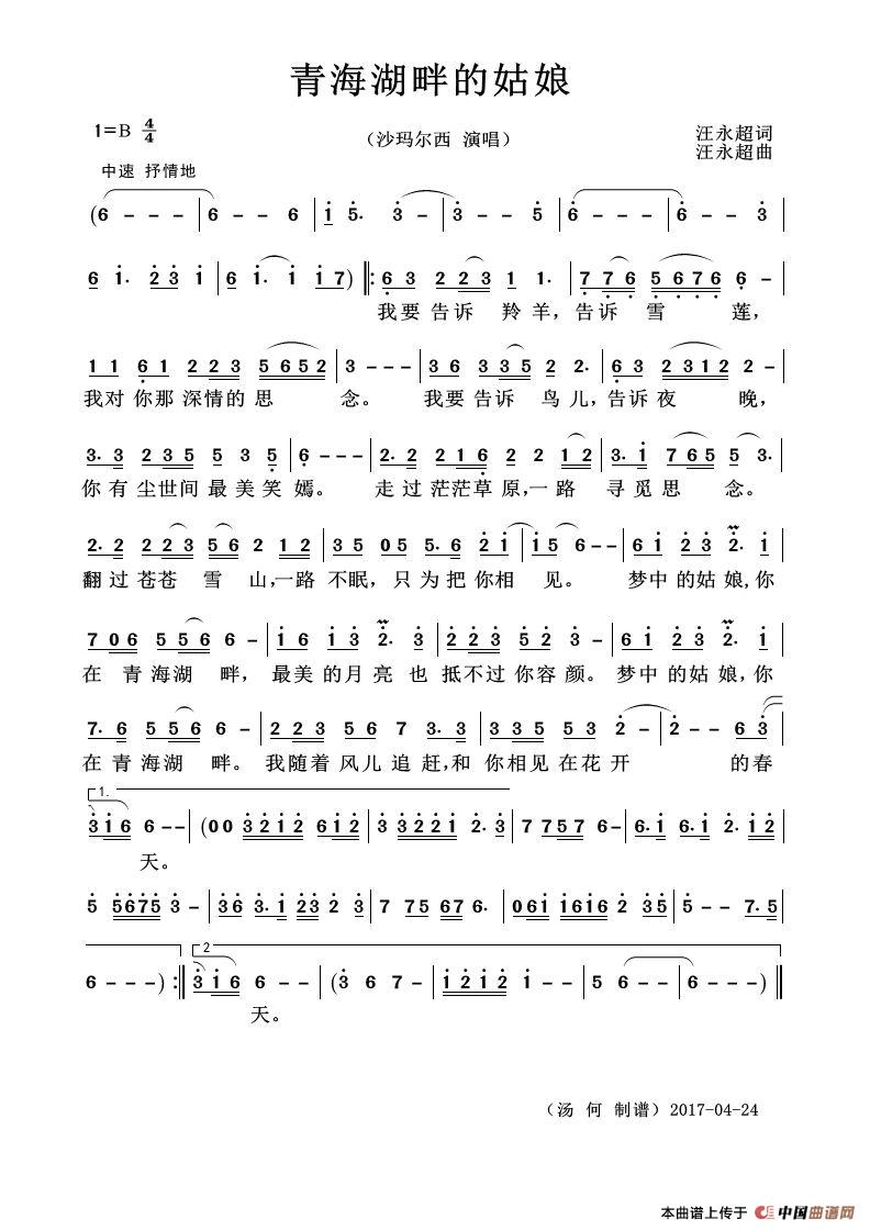 《青海湖畔的姑娘》最新曲谱 沙玛尔西