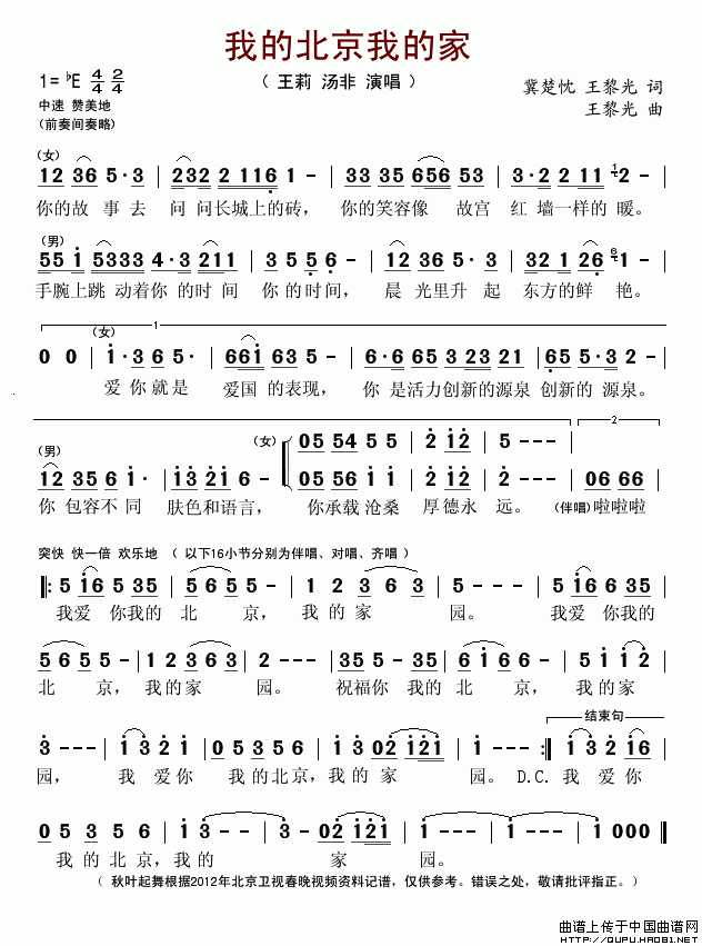 王莉、汤非演唱的我的北京我的家歌词,我的北京我的家最新曲谱.