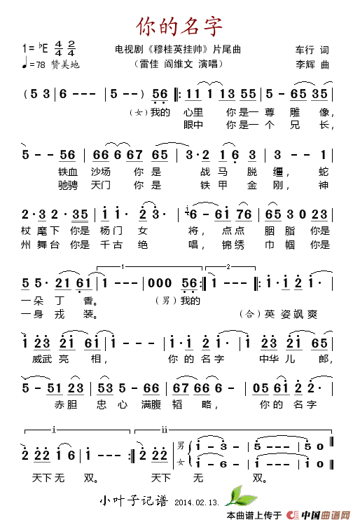 雷佳\阎维文演唱的你的名字(电视剧《穆桂英挂帅》片尾曲)歌词,你的名字(电视剧《穆桂英挂帅》片尾曲)最新曲谱.